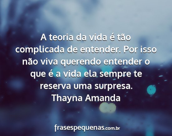 A teoria da vida é tão complicada de entender. Por isso não viva querendo entender o que é a vida ela sempre te reserva uma surpresa.Thayna Amanda