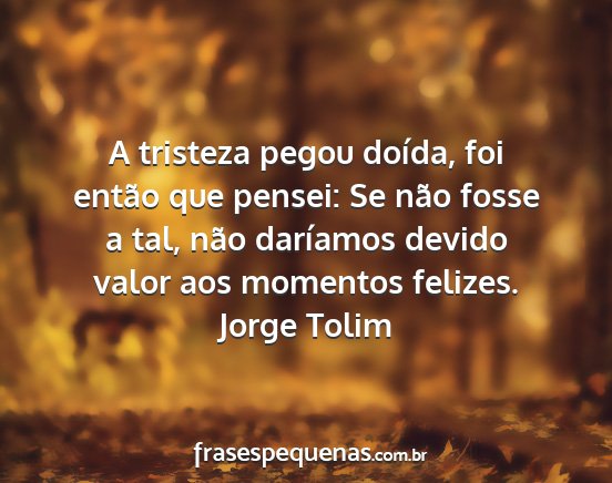 A tristeza pegou doída, foi então que pensei: Se não fosse a tal, não daríamos devido valor aos momentos felizes.Jorge Tolim