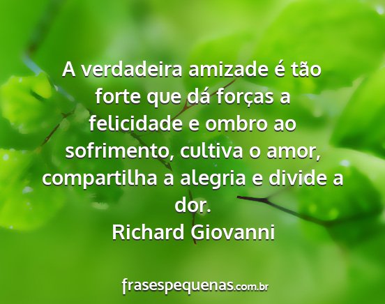 A verdadeira amizade é tão forte que dá forças a felicidade e ombro ao sofrimento, cultiva o amor, compartilha a alegria e divide a dor.Richard Giovanni