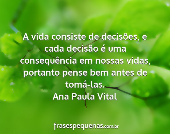 A vida consiste de decisões, e cada decisão é uma consequência em nossas vidas, portanto pense bem antes de tomá-las.Ana Paula Vital