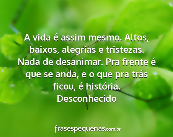 A vida é assim mesmo. Altos, baixos, alegrias e tristezas. Nada de desanimar. Pra frente é que se anda, e o que pra trás ficou, é história.Desconhecido