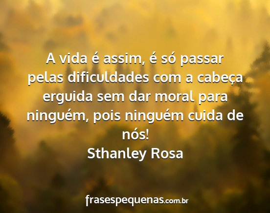 A vida é assim, é só passar pelas dificuldades com a cabeça erguida sem dar moral para ninguém, pois ninguém cuida de nós!Sthanley Rosa