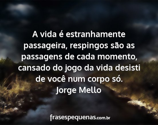 A vida é estranhamente passageira, respingos são as passagens de cada momento, cansado do jogo da vida desisti de você num corpo só.Jorge Mello