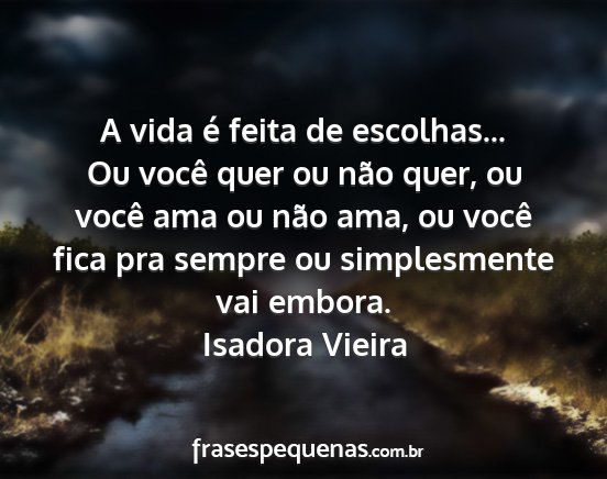 A vida é feita de escolhas... Ou você quer ou não quer, ou você ama ou não ama, ou você fica pra sempre ou simplesmente vai embora.Isadora Vieira