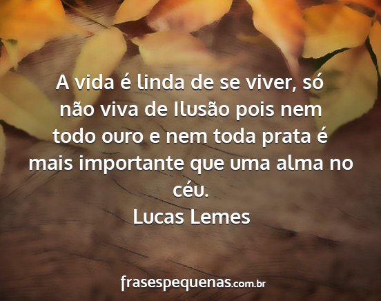 A vida é linda de se viver, só não viva de Ilusão pois nem todo ouro e nem toda prata é mais importante que uma alma no céu.Lucas Lemes