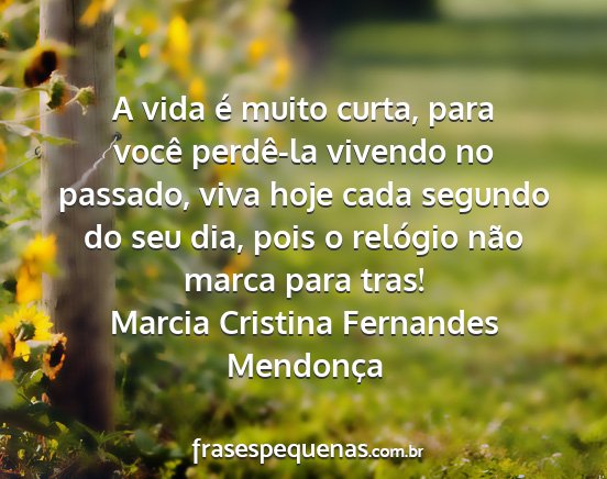 A vida é muito curta, para você perdê-la vivendo no passado, viva hoje cada segundo do seu dia, pois o relógio não marca para tras!Marcia Cristina Fernandes Mendonça