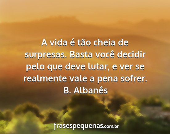 A vida é tão cheia de surpresas. Basta você decidir pelo que deve lutar, e ver se realmente vale a pena sofrer.B. Albanês