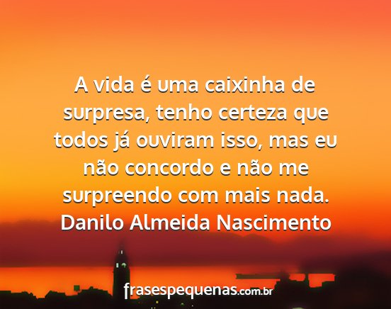 A vida é uma caixinha de surpresa, tenho certeza que todos já ouviram isso, mas eu não concordo e não me surpreendo com mais nada.Danilo Almeida Nascimento