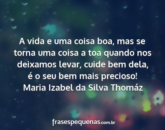 A vida e uma coisa boa, mas se torna uma coisa a toa quando nos deixamos levar, cuide bem dela, é o seu bem mais precioso!Maria Izabel da Silva Thomáz