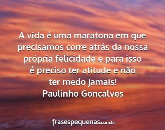 A vida é uma maratona em que precisamos corre atrás da nossa própria felicidade e para isso é preciso ter atitude e não ter medo jamais!Paulinho Gonçalves