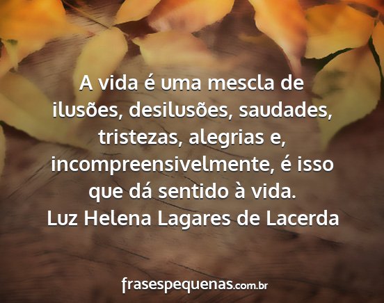A vida é uma mescla de ilusões, desilusões, saudades, tristezas, alegrias e, incompreensivelmente, é isso que dá sentido à vida.Luz Helena Lagares de Lacerda