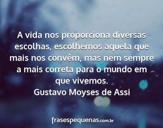 A vida nos proporciona diversas escolhas, escolhemos aquela que mais nos convêm, mas nem sempre a mais correta para o mundo em que vivemos.Gustavo Moyses de Assi