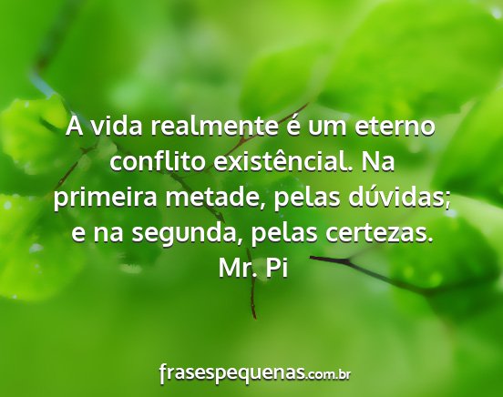 A vida realmente é um eterno conflito existêncial. Na primeira metade, pelas dúvidas; e na segunda, pelas certezas.Mr. Pi