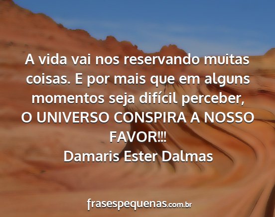 A vida vai nos reservando muitas coisas. E por mais que em alguns momentos seja difícil perceber, O UNIVERSO CONSPIRA A NOSSO FAVOR!!!Damaris Ester Dalmas