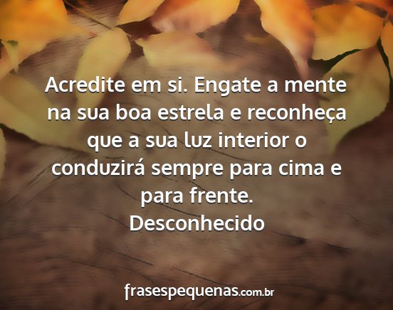 Acredite em si. Engate a mente na sua boa estrela e reconheça que a sua luz interior o conduzirá sempre para cima e para frente.Desconhecido