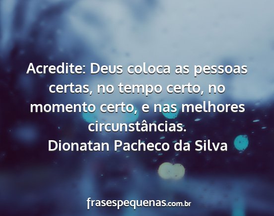 Acredite: Deus coloca as pessoas certas, no tempo certo, no momento certo, e nas melhores circunstâncias.Dionatan Pacheco da Silva