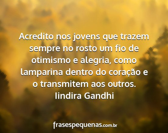 Acredito nos jovens que trazem sempre no rosto um fio de otimismo e alegria, como lamparina dentro do coração e o transmitem aos outros.Iindira Gandhi