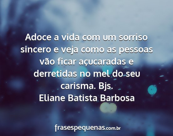 Adoce a vida com um sorriso sincero e veja como as pessoas vão ficar açucaradas e derretidas no mel do seu carisma. Bjs.Eliane Batista Barbosa