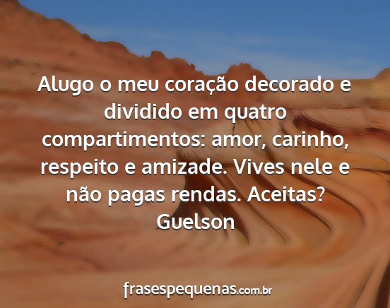 Alugo o meu coração decorado e dividido em quatro compartimentos: amor, carinho, respeito e amizade. Vives nele e não pagas rendas. Aceitas?Guelson