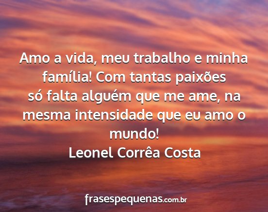 Amo a vida, meu trabalho e minha família! Com tantas paixões só falta alguém que me ame, na mesma intensidade que eu amo o mundo!Leonel Corrêa Costa