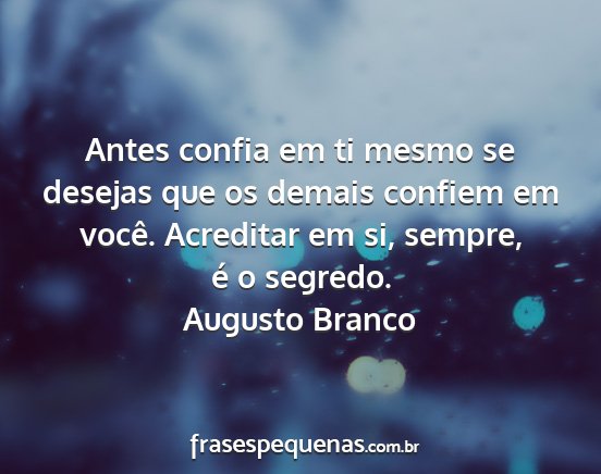 Antes confia em ti mesmo se desejas que os demais confiem em você. Acreditar em si, sempre, é o segredo.Augusto Branco
