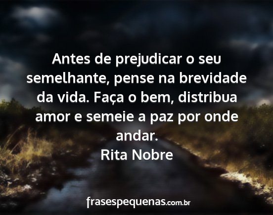 Antes de prejudicar o seu semelhante, pense na brevidade da vida. Faça o bem, distribua amor e semeie a paz por onde andar.Rita Nobre