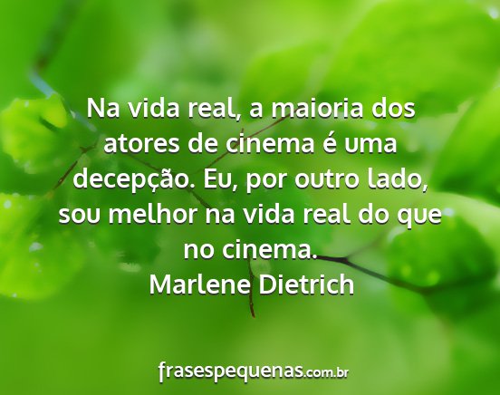 Na vida real, a maioria dos atores de cinema é uma decepção. Eu, por outro lado, sou melhor na vida real do que no cinema.Marlene Dietrich