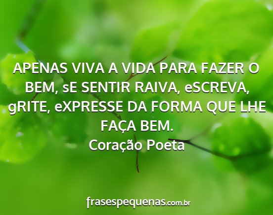 APENAS VIVA A VIDA PARA FAZER O BEM, sE SENTIR RAIVA, eSCREVA, gRITE, eXPRESSE DA FORMA QUE LHE FAÇA BEM.Coração Poeta