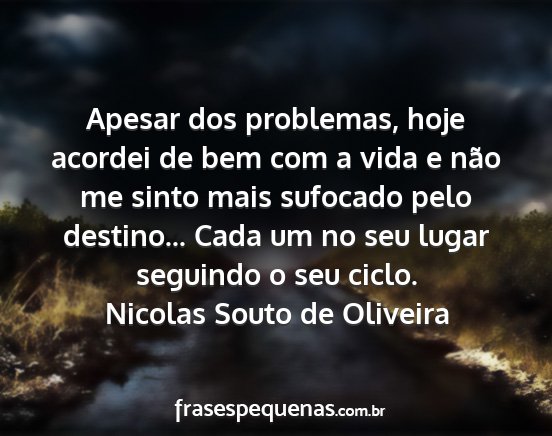 Apesar dos problemas, hoje acordei de bem com a vida e não me sinto mais sufocado pelo destino... Cada um no seu lugar seguindo o seu ciclo.Nicolas Souto de Oliveira