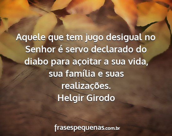 Aquele que tem jugo desigual no Senhor é servo declarado do diabo para açoitar a sua vida, sua família e suas realizações.Helgir Girodo