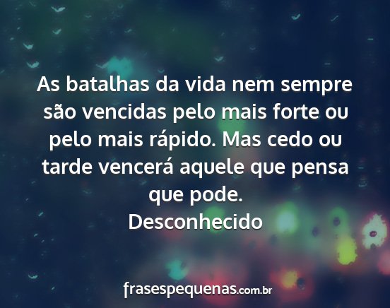 As batalhas da vida nem sempre são vencidas pelo mais forte ou pelo mais rápido. Mas cedo ou tarde vencerá aquele que pensa que pode.Desconhecido