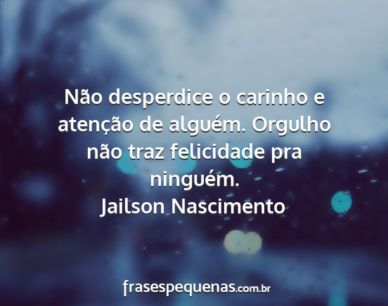 Não desperdice o carinho e atenção de alguém. Orgulho não traz felicidade pra ninguém.Jailson Nascimento