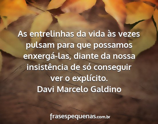 As entrelinhas da vida às vezes pulsam para que possamos enxergá-las, diante da nossa insistência de só conseguir ver o explícito.Davi Marcelo Galdino