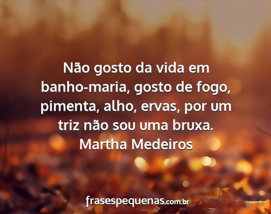 Não gosto da vida em banho-maria, gosto de fogo, pimenta, alho, ervas, por um triz não sou uma bruxa.Martha Medeiros