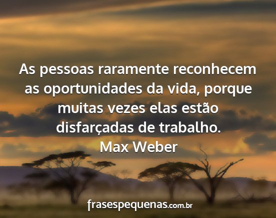 As pessoas raramente reconhecem as oportunidades da vida, porque muitas vezes elas estão disfarçadas de trabalho.Max Weber