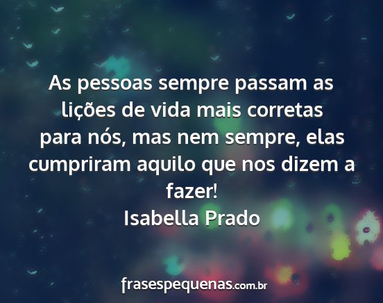 As pessoas sempre passam as lições de vida mais corretas para nós, mas nem sempre, elas cumpriram aquilo que nos dizem a fazer!Isabella Prado