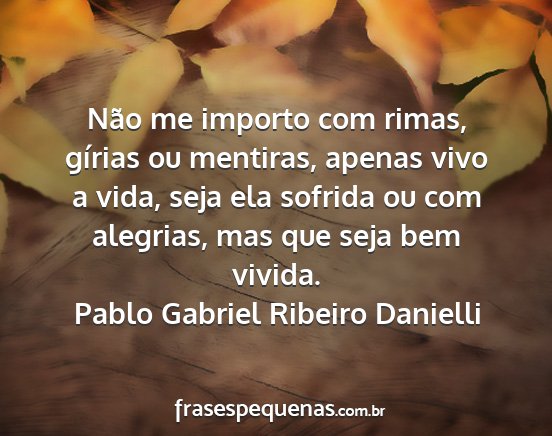 Não me importo com rimas, gírias ou mentiras, apenas vivo a vida, seja ela sofrida ou com alegrias, mas que seja bem vivida.Pablo Gabriel Ribeiro Danielli