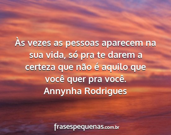 Às vezes as pessoas aparecem na sua vida, só pra te darem a certeza que não é aquilo que você quer pra você.Annynha Rodrigues
