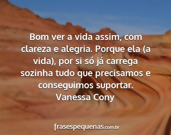 Bom ver a vida assim, com clareza e alegria. Porque ela (a vida), por si só já carrega sozinha tudo que precisamos e conseguimos suportar.Vanessa Cony