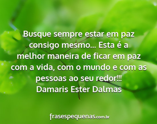 Busque sempre estar em paz consigo mesmo... Esta é a melhor maneira de ficar em paz com a vida, com o mundo e com as pessoas ao seu redor!!!Damaris Ester Dalmas