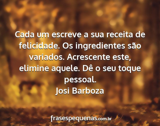 Cada um escreve a sua receita de felicidade. Os ingredientes são variados. Acrescente este, elimine aquele. Dê o seu toque pessoal.Josi Barboza