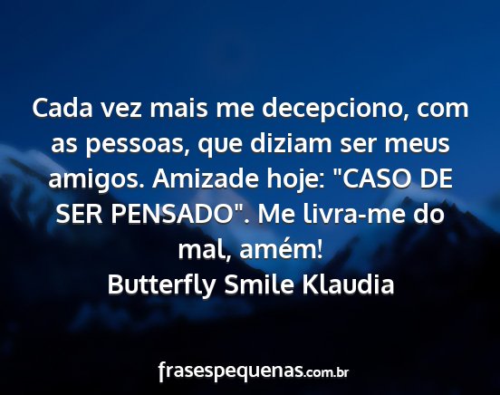 Cada vez mais me decepciono, com as pessoas, que diziam ser meus amigos. Amizade hoje: "CASO DE SER PENSADO". Me livra-me do mal, amém!Butterfly Smile Klaudia
