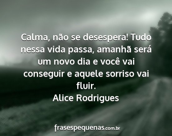 Calma, não se desespera! Tudo nessa vida passa, amanhã será um novo dia e você vai conseguir e aquele sorriso vai fluir.Alice Rodrigues
