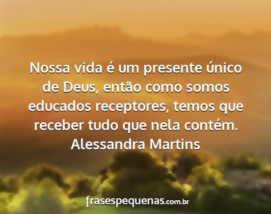 Nossa vida é um presente único de Deus, então como somos educados receptores, temos que receber tudo que nela contém.Alessandra Martins