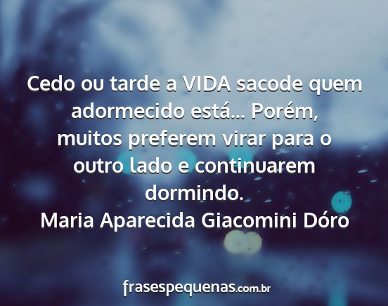 Cedo ou tarde a VIDA sacode quem adormecido está... Porém, muitos preferem virar para o outro lado e continuarem dormindo.Maria Aparecida Giacomini Dóro