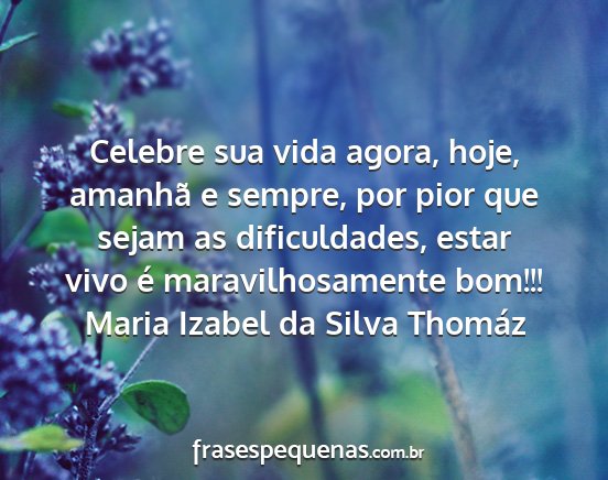 Celebre sua vida agora, hoje, amanhã e sempre, por pior que sejam as dificuldades, estar vivo é maravilhosamente bom!!!Maria Izabel da Silva Thomáz