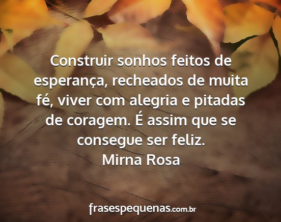 Construir sonhos feitos de esperança, recheados de muita fé, viver com alegria e pitadas de coragem. É assim que se consegue ser feliz.Mirna Rosa