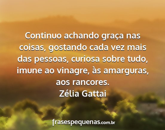 Continuo achando graça nas coisas, gostando cada vez mais das pessoas, curiosa sobre tudo, imune ao vinagre, às amarguras, aos rancores.Zélia Gattai