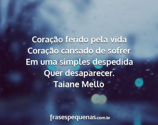 Coração ferido pela vidaCoração cansado de sofrerEm uma simples despedidaQuer desaparecer.Taiane Mello