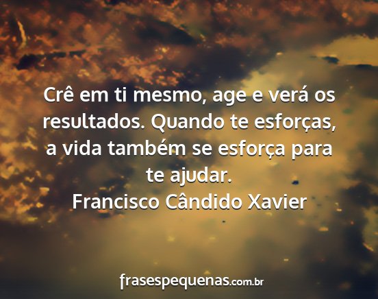 Crê em ti mesmo, age e verá os resultados. Quando te esforças, a vida também se esforça para te ajudar.Francisco Cândido Xavier